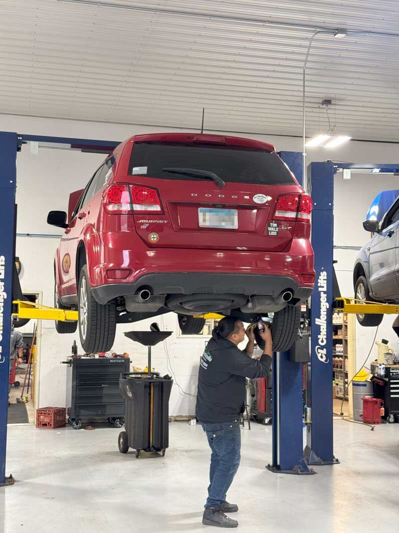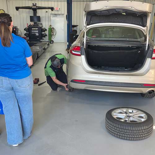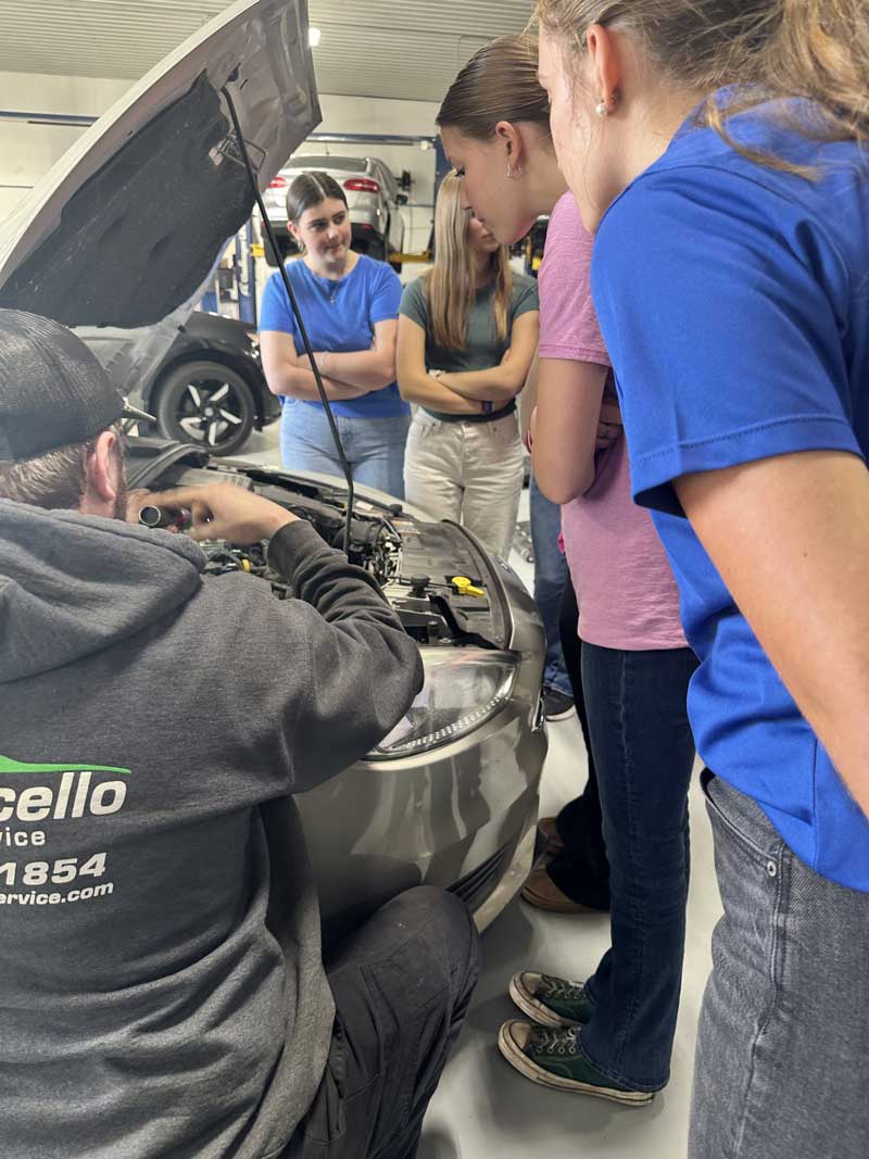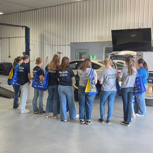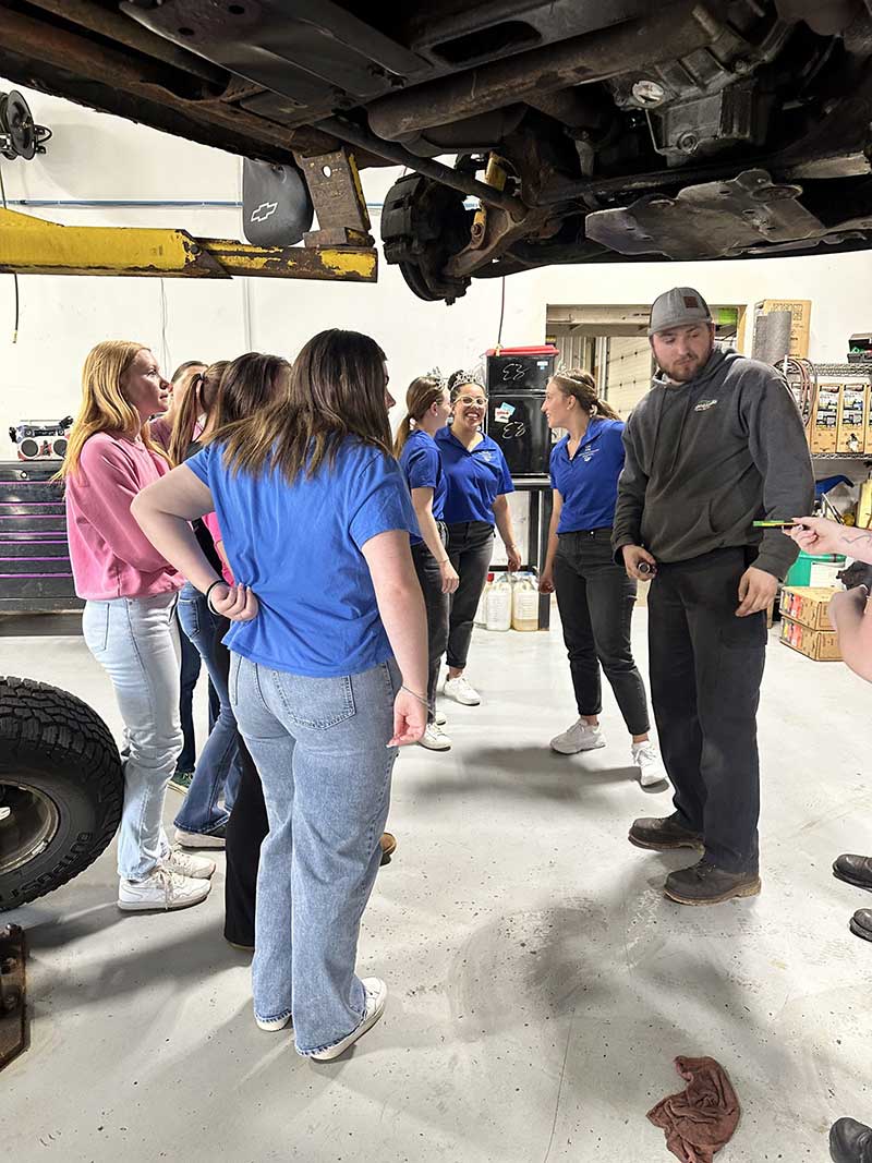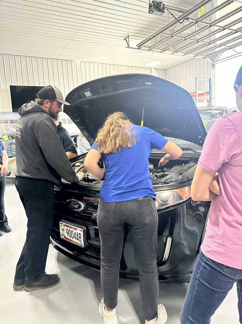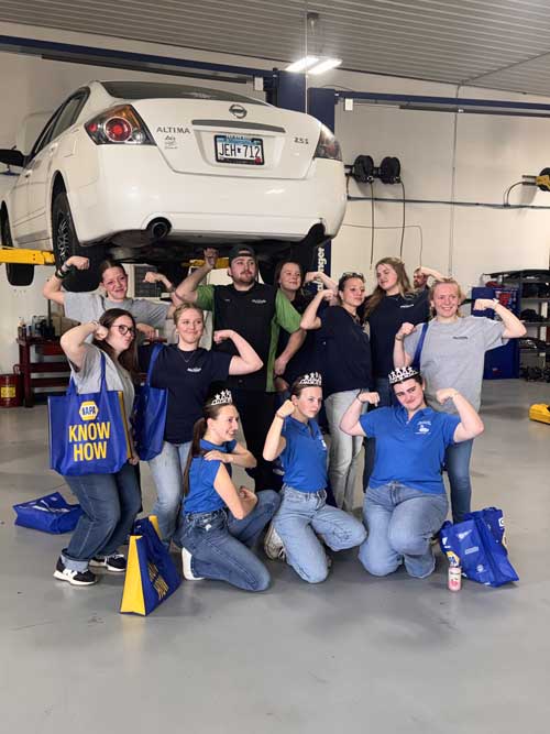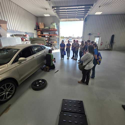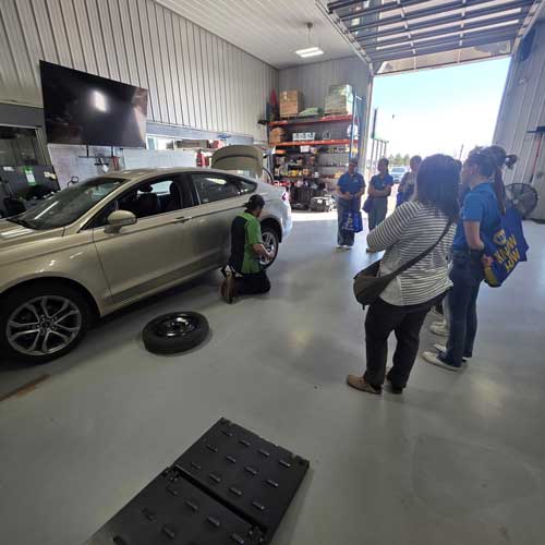 Our team — Calvin (Manager), Troy (Foreman), Matt (Technician), Logan (Technician), Caitlin (Advisor), and Misa (Advisor) — spent the day teaching the ambassadors essential vehicle maintenance skills. Together, we covered how to safely change a spare tire, check vital fluids like oil, coolant, washer fluid, and transmission fluid, and even inspect and replace air filters and wiper blades.